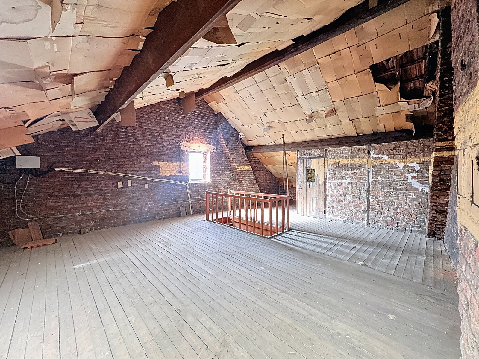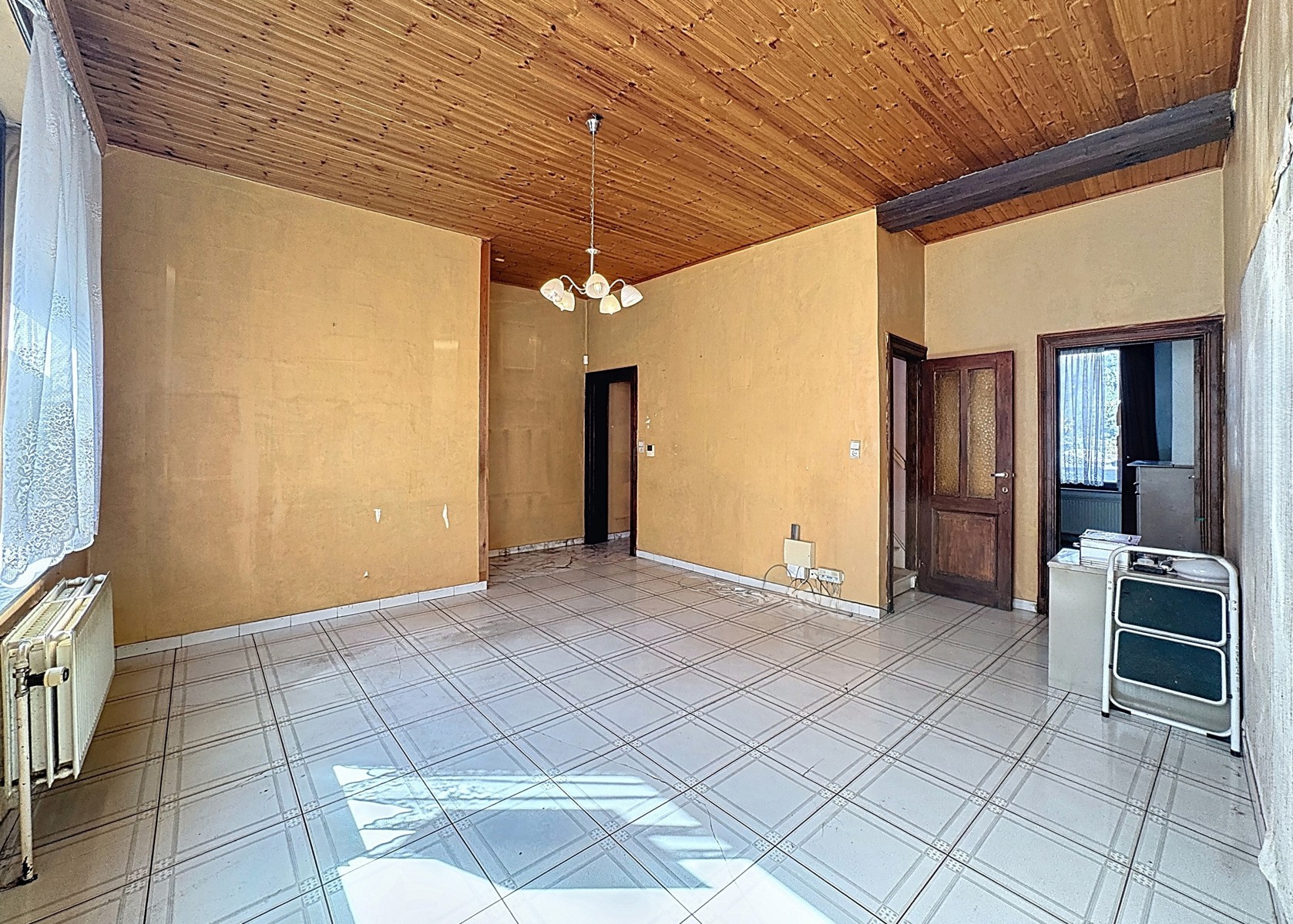 Située à deux pas des commodités, maison 4 façades à rénover avec passage latéral (servitude). D'une superficie habitable de 170 m², le bien est composé comme suit : hall d'entrée 3 m², salon de 26 m², salle à manger ou future cuisine 23 m². À l'étage (structure plancher) : sas de nuit, chambre à l'avant de 28 m², chambre en enfilade de 13 m² et pièce polyvalente de 12 m² (chambre, salle de bains, bureau, dressing...). En sous-toiture (non isolée) : vaste grenier aménageable en chambre(s) de 45 m² ! Au sous-sol : caves sur l'avant, pièce chaufferie 20 m² donnant accès à un vaste garage/entrepôt de 56 m² pouvant devenir également une vaste pièce de vie complémentaire ! À l'extérieur : vaste jardin orienté à l'ouest 360 m² + 566 m² de parcelle (pâturage) en arrière-zone (voir photo plan cadastral). Toiture en tuile à vérifier (toiture de l'annexe en bon état), chauffage central gaz de ville (chaudière de 2011), châssis D.V. bois + volets, installation électrique non conforme, raccordement à l'égout. PEB indice E. Maison idéale pour famille nombreuse et/ou pour cumuler vie privée et professionnelle. R.C. net 709 € — Prix demandé 159.000 € (maison + terrain pâturage à l'arrière). Tél. 04/246.33.46 ou 0477/64.69.38 (Angelo Ponente). Informations à titre informatif et non contractuel.